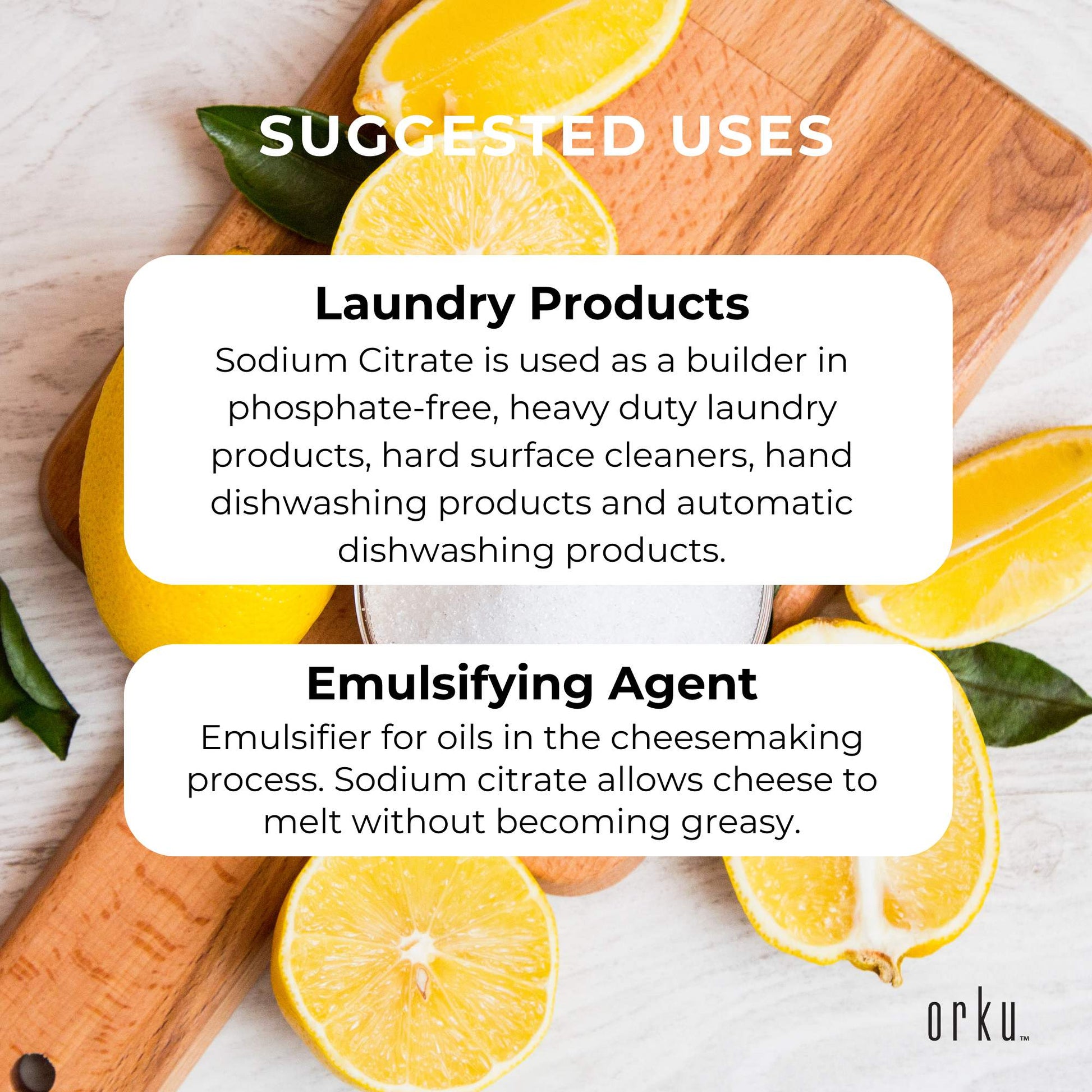 Sodium Citrate is used as a builder in phosphate-free, heavy duty laundry products, hard surface cleaners, hand dishwashing products and automatic dishwashing products.