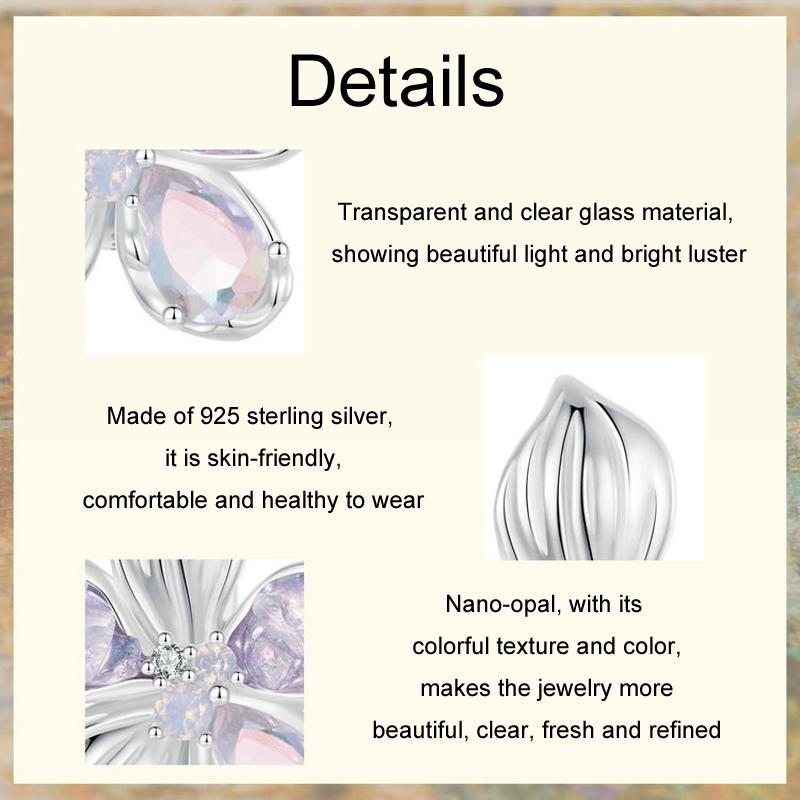 Features: • Made of 925 sterling silver for skin-friendly and comfortable wear • Transparent and clear glass material for a beautiful light and bright luster • Nano-opal adds colourful texture and enhances the beauty of the jewelry • Unique design with oil drop and zircon accents • Lightweight at only 2.2 grams