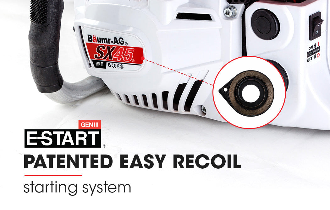 Also new on the SX range is the exclusive E-Start system. This patented technology means just about anyone can pull start large capacity machines with minimal effort. E-Start works by pairing two opposing memory retaining spring coils. As the user pulls the starter cord, a second coil builds energy and releases that energy all at once - instantly firing the engine! There really is nothing else on the market like it.