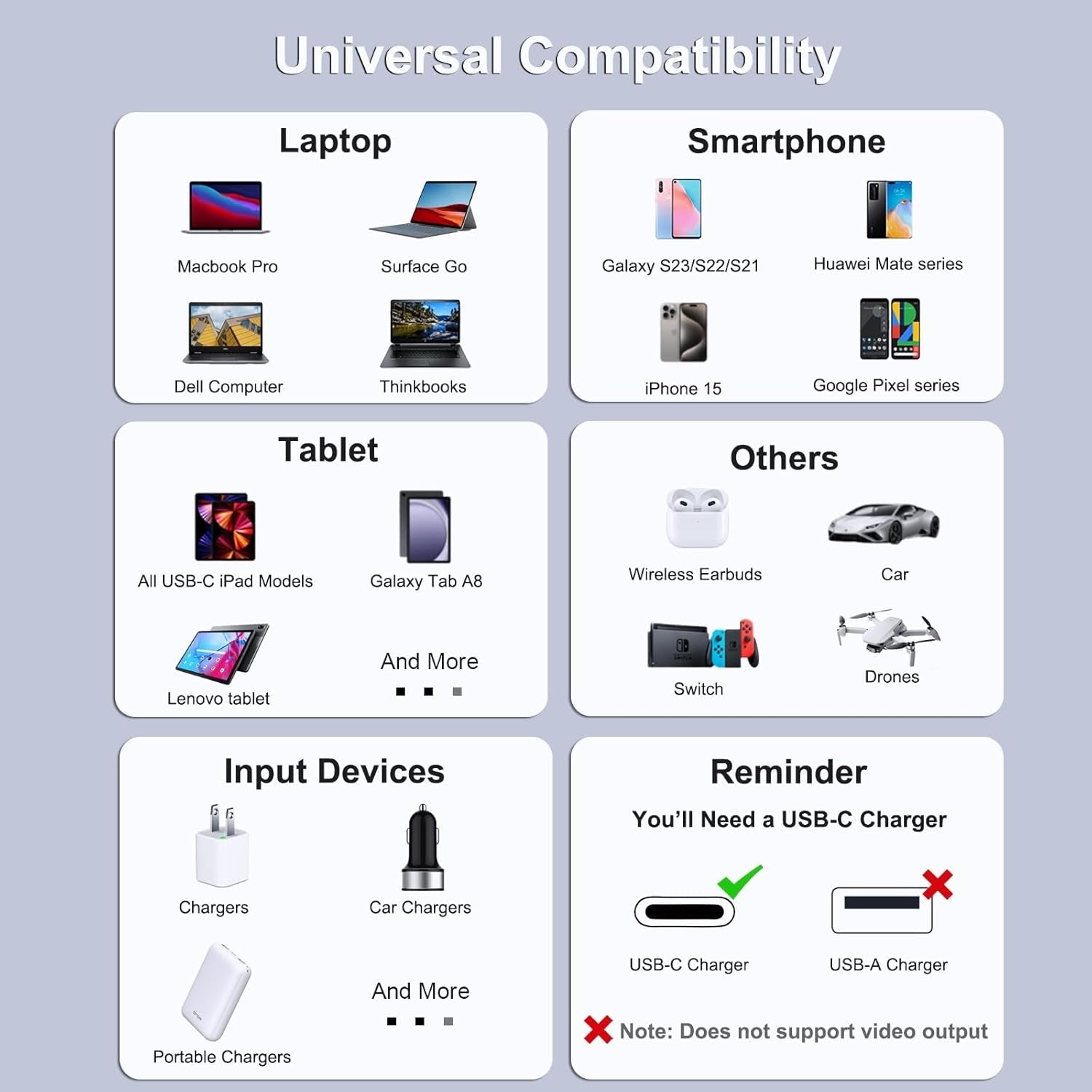 Fast Charging Supports a max power output of 100W when paired with a 100W or above wall charger to power up virtually any USB-C device, including phones, tablets, and laptops. (This cable does not support media display.)