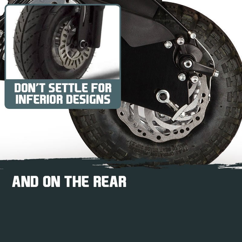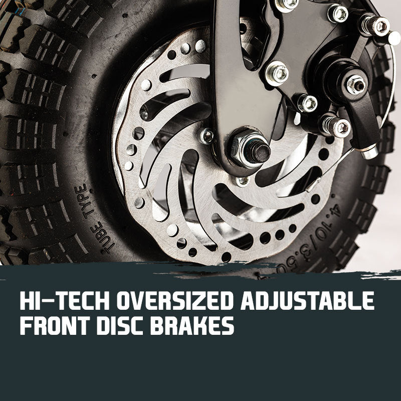 Of course, our boffins paid equal attention to the handling -a high-tensile yet lightweight steel frame houses tough polished steel shocks, massive disc brakes and oversized knobby 10-inch tyres. For those that like to tinker with their toys, you'll love how easy it is to tweak the shocks and brakes to your riding style.
