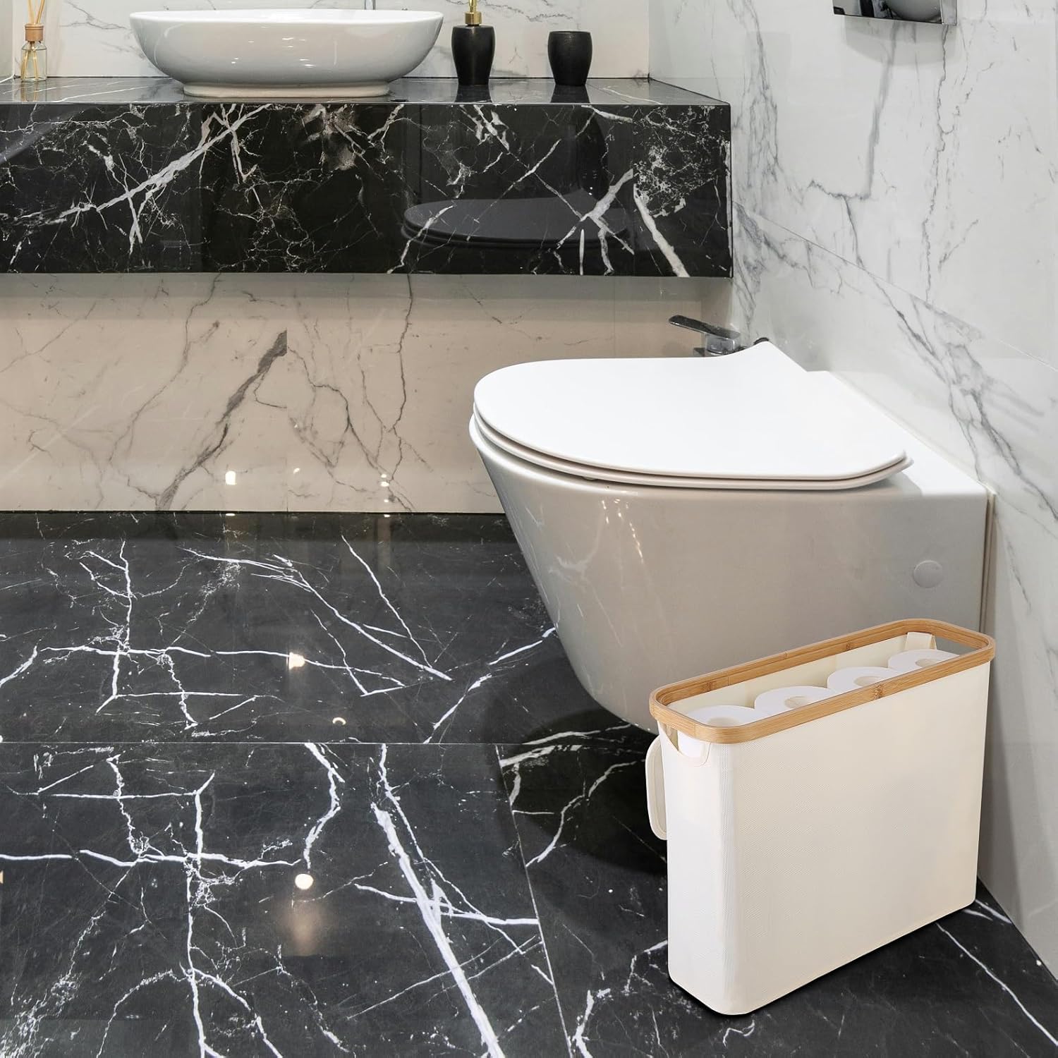 - LARGE STORAGE CAPACITY: This slim basket holds up to 12 regular toilet paper rolls or 9 jumbo rolls, helping you stay fully stocked and organized. A perfect fit for small bathrooms, closets, RVs, or under-sink spaces.