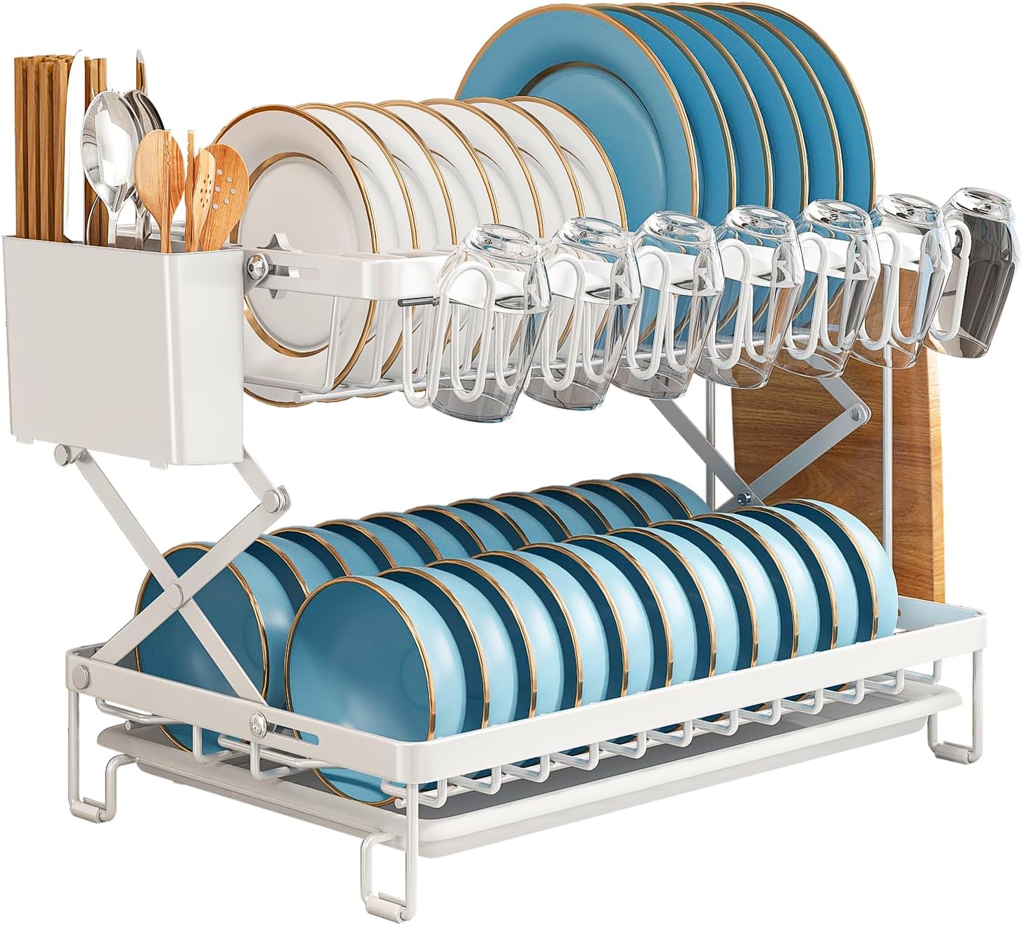 2-TIER LARGE CAPACITY DESIGN: Maximize your countertop space with a double-layer structure that holds up to 13 plates on the top rack and 22 bowls on the lower tier. Additional zones accommodate cups, utensils, and cutting boards — perfect for compact kitchens.