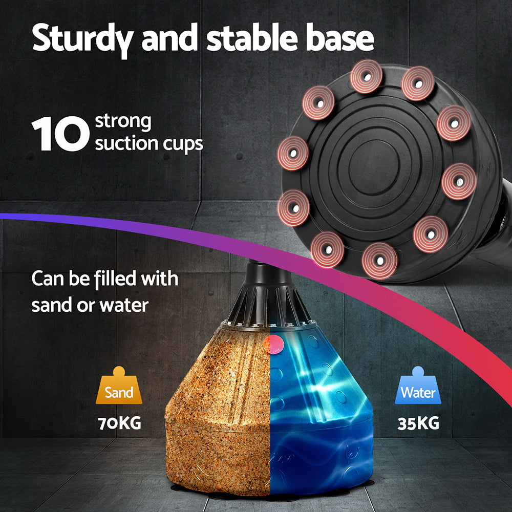 Features Freestanding boxing bag stand kit Sturdy multi-layered material Thick and stable base 10 strong suction cups Reinforced shock absorption system High rebound Easy installation Fill the base with sand or water Punching game to relieve pressure and increase fitness Ideal fitness and training equipment