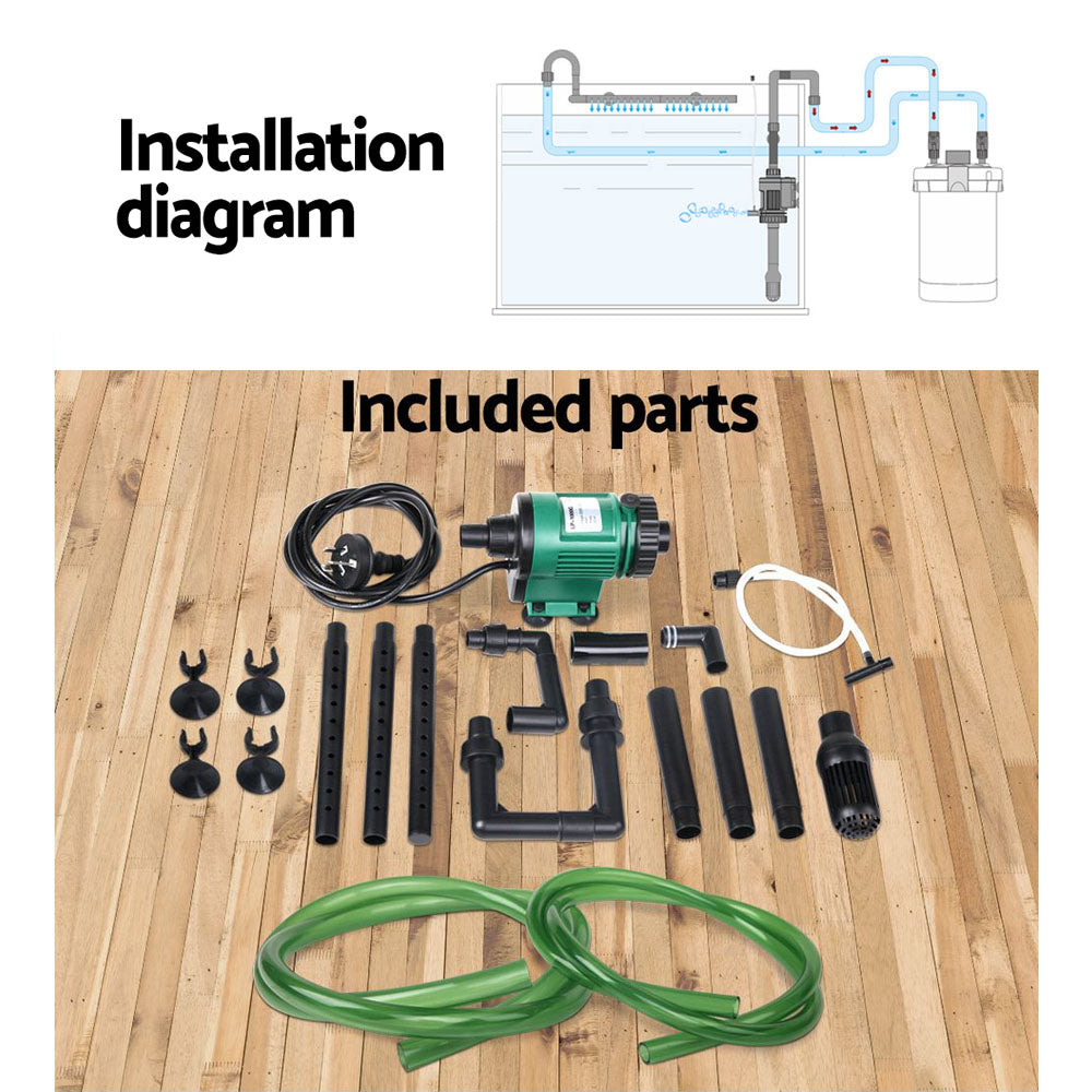 1250L/H | 4 Stage Filtration| Leak Proof Use a multi-level approach to filtration and filter your tank water with our Giantz Aquarium Filter and Pump. This external filter is designed to be positioned outside of the tank and draw water into the filter through an inlet tube and return the water via an outlet tube. Suitable for both freshwater and saltwater aquariums sized up to 250 litres, this type of external filter avoids the need for an unsightly filter inside the tank. It runs on 14W power for energy-efficient operation and has a flow rate of up to 1250L/h. The 4-level stackable filter design means you can create a filtration system to suit your needs, by using all or some tiers and filling with your preferred media (media not included). Designed with a tight cap lock with no need to worry about leaks and coming with a full set of accessories, it is very easy to set up without any specialised tools required. Once you start filtering your tank, you will begin to see clearer and purer waters and be able to take active control over your water characteristics.