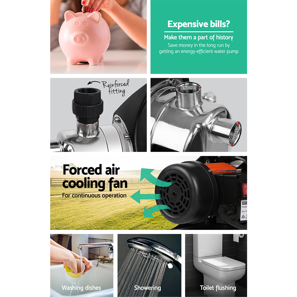 GIANTZ Stainless Steel Garden Pump Made from durable stainless steel and alloy, this garden pump is the perfect water pump for your home and garden. It is ideal for connecting your rain tank or to irrigate your garden. This pump produces Max 54L/min makes it effortless in irrigating the garden or veggie patch. The pump has overheat and overload protections; makes it very safe to use.