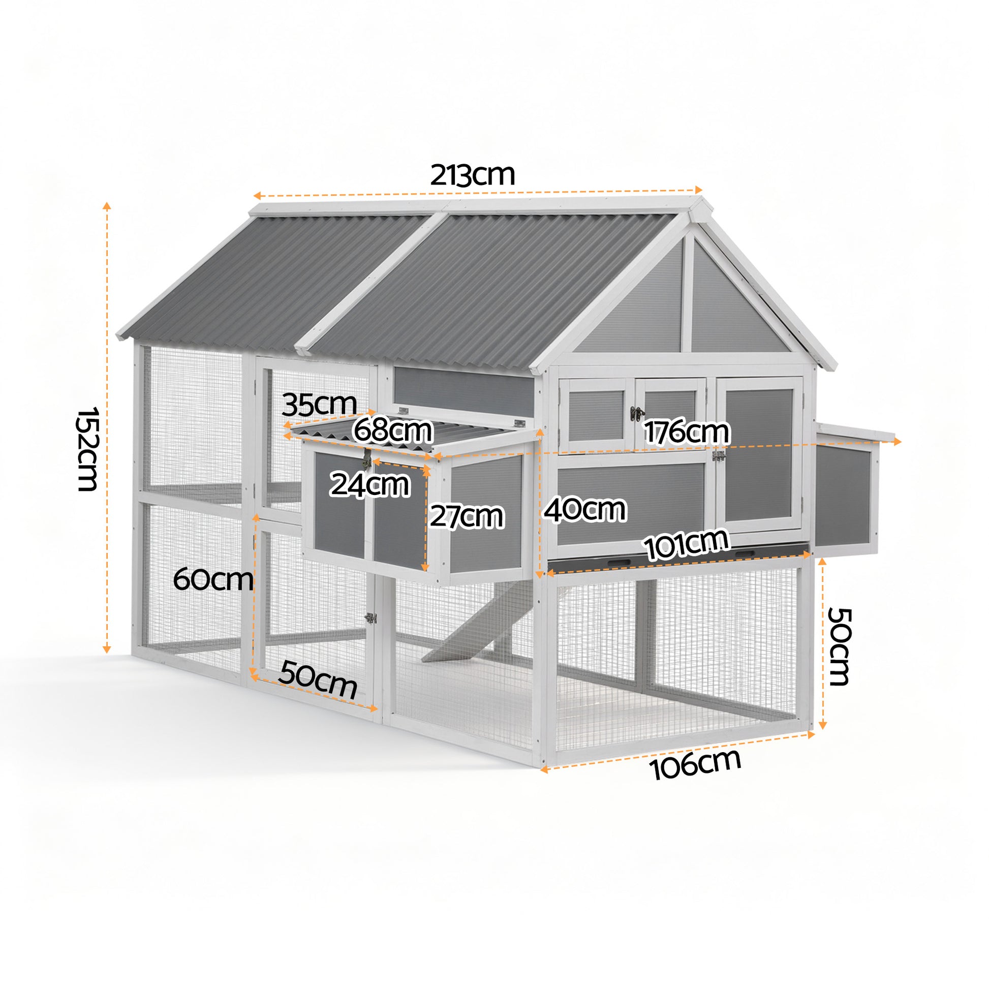 Specifications: Brand: i.Pet Frame material: Fir Wood, Polycarbonate, PVC Mesh material: Powder-coated wire Overall dimensions: 213cm X 176cm X 152cm Colour: Grey and white Assembly required: Yes No. of packages: 2