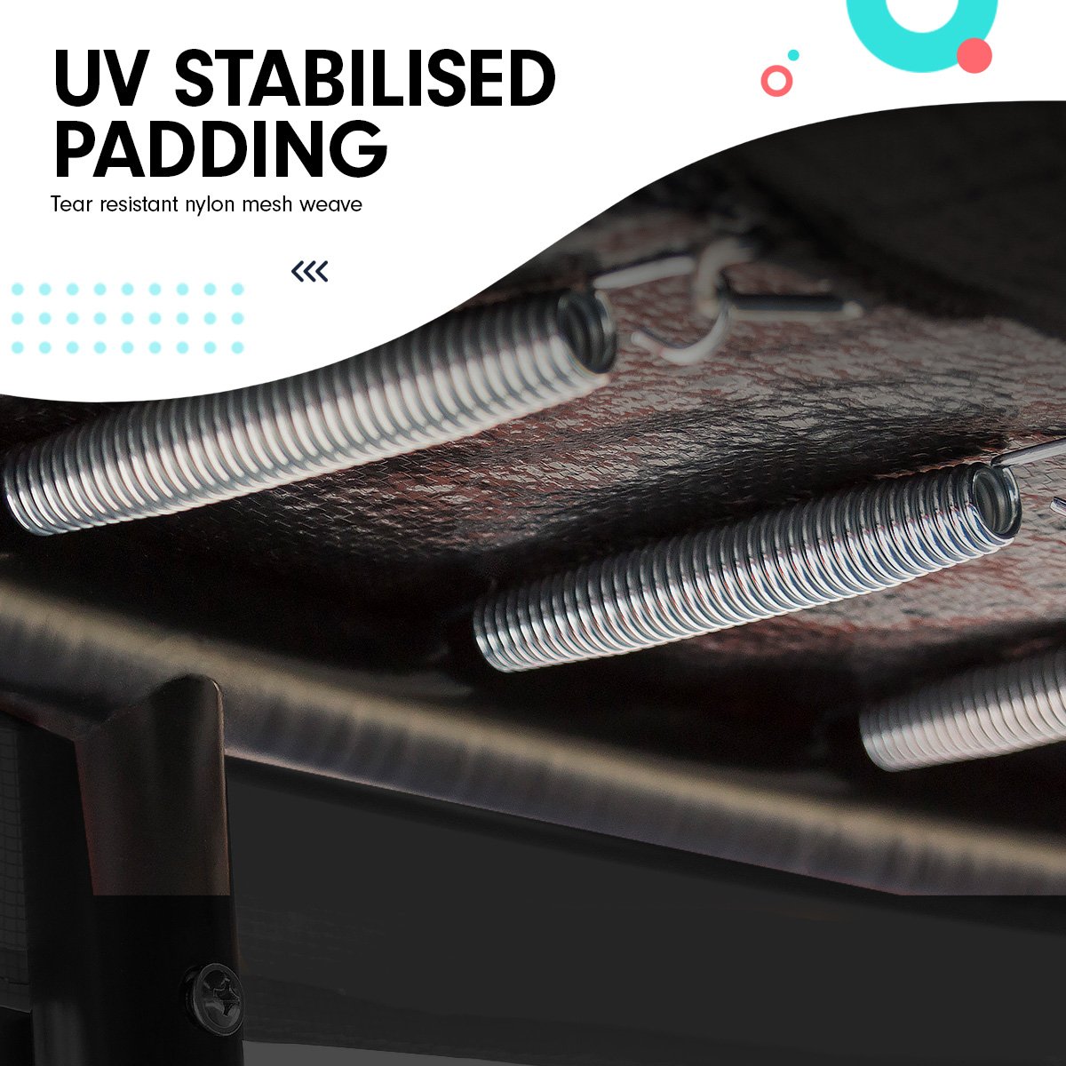 The padding cover of the trampoline is UV stabilised and has embedded nylon mesh, ensuring the padding will last under the harsh Australian sun.