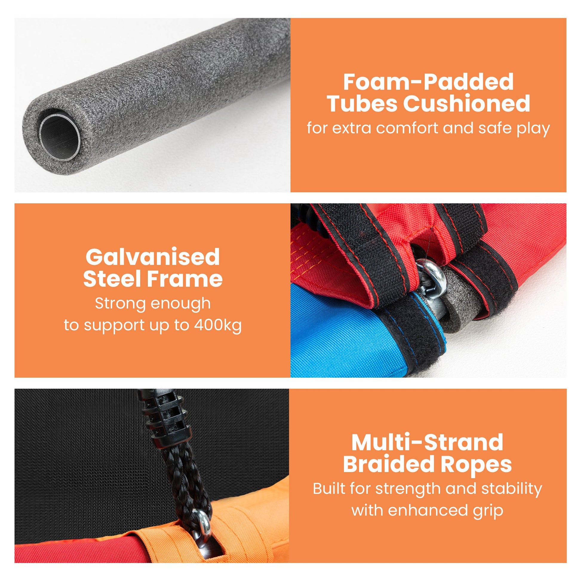 Get ready for endless swinging fun with Kahunas tree swing set! It features a sturdy galvanised pipe frame, comfy padded foam tubes and fun extras like colourful flags. With extension straps, carabiners, and mountaineering buckles included, setting it up is super easy, just hang it up and let the good times roll. It is perfect for kids who love to swing, sway and enjoy the great outdoors!
