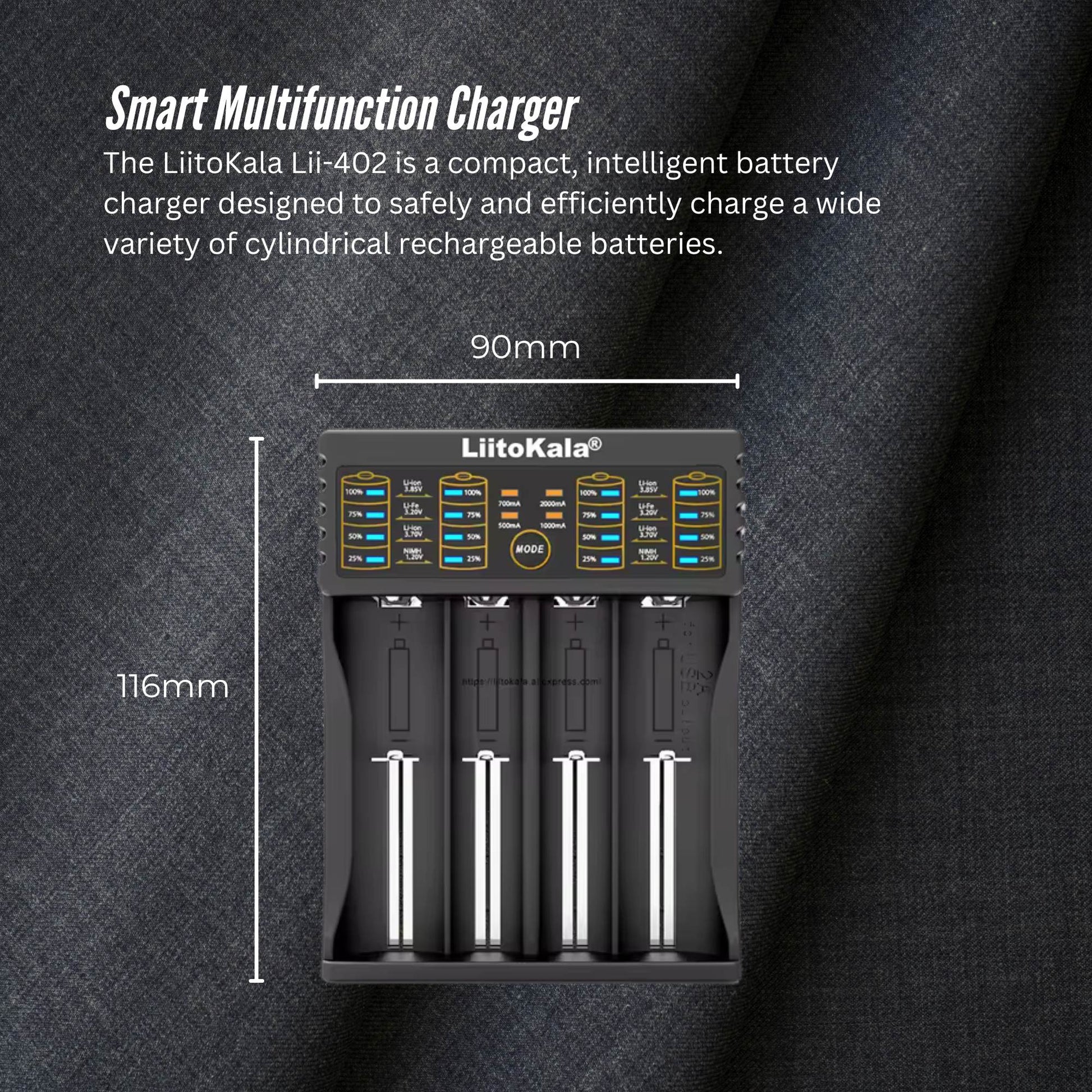 The LiitoKala Lii-402 is a compact, intelligent battery charger designed to safely and efficiently charge a wide variety of cylindrical rechargeable batteries. Supporting Li-ion (3.7V / 3.8V), NiMH/NiCd (1.2V), and LiFePO4 (3.2V) chemistries, it offers four independent charging slots with selectable current options (0.5A or 1A), LED indicators, and full safety protection. Featuring Micro USB input and USB output functionality, it's perfect for both home and travel use.