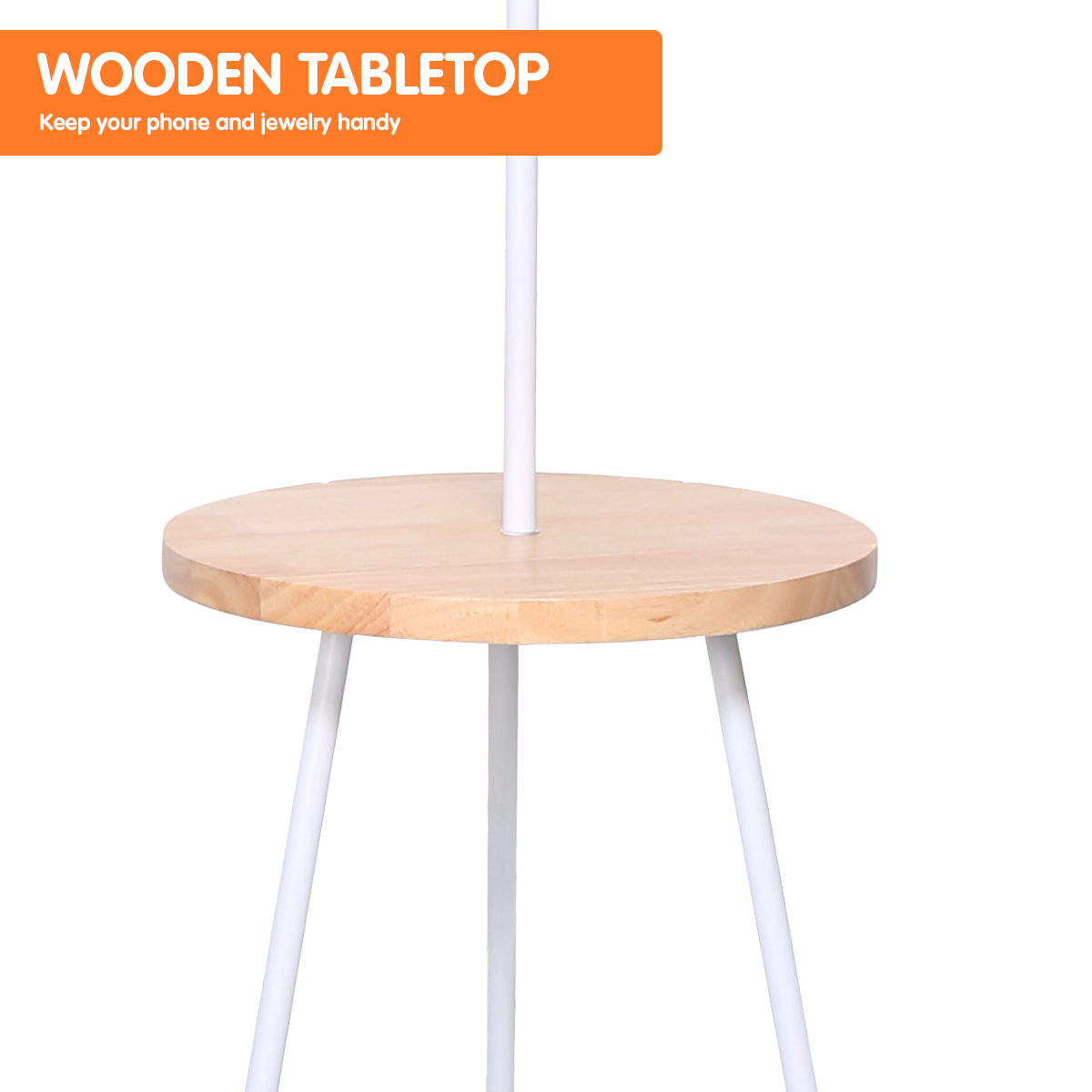 Save floor space in your living room, bedroom, or office with this unique tripod floor lamp. It features a wooden tabletop that's perfect for displaying photos or keeping remotes, smartphones, and other essential items nearby.