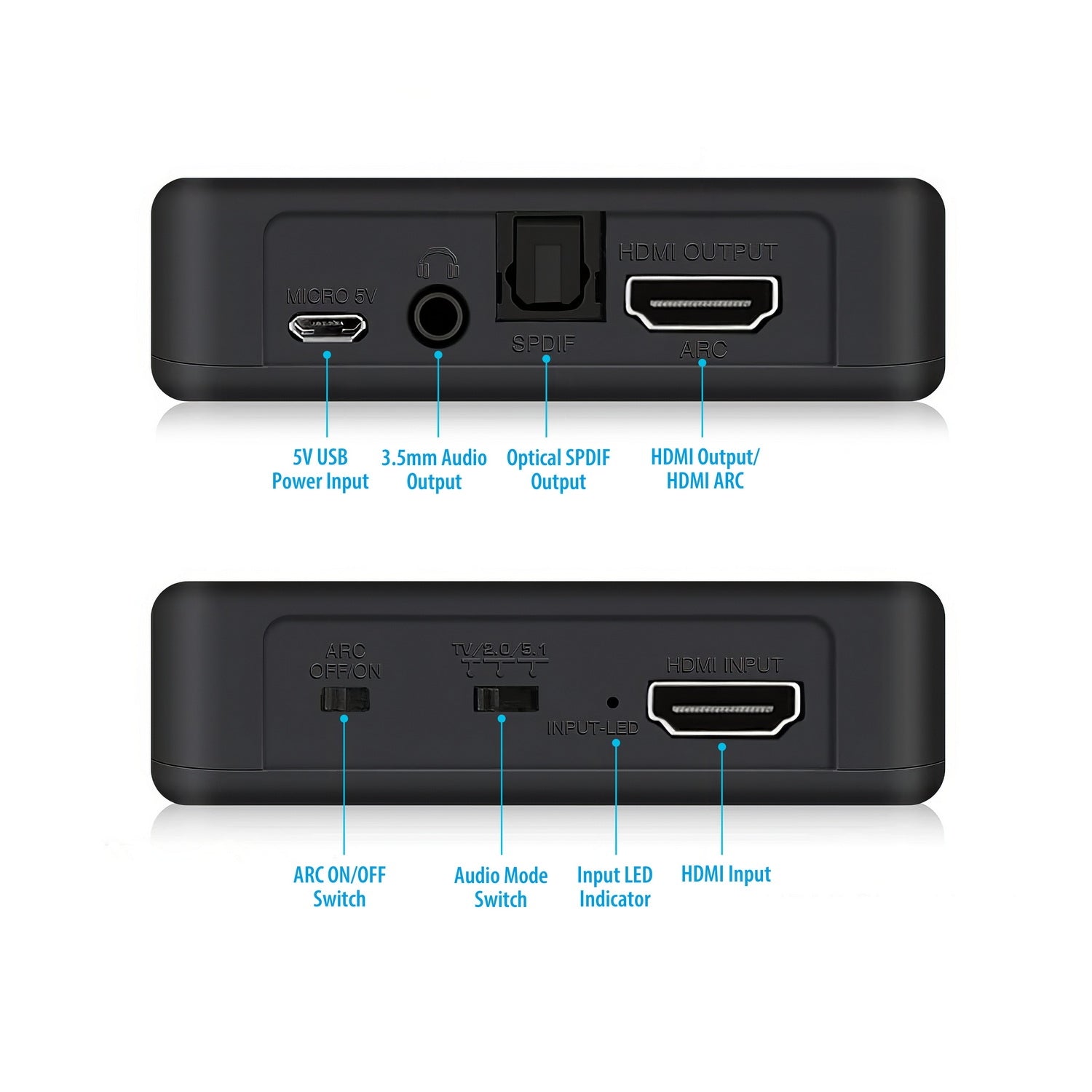 - Optical SPDIF and 3.5mm audio output extracted from HDMI input or ARC