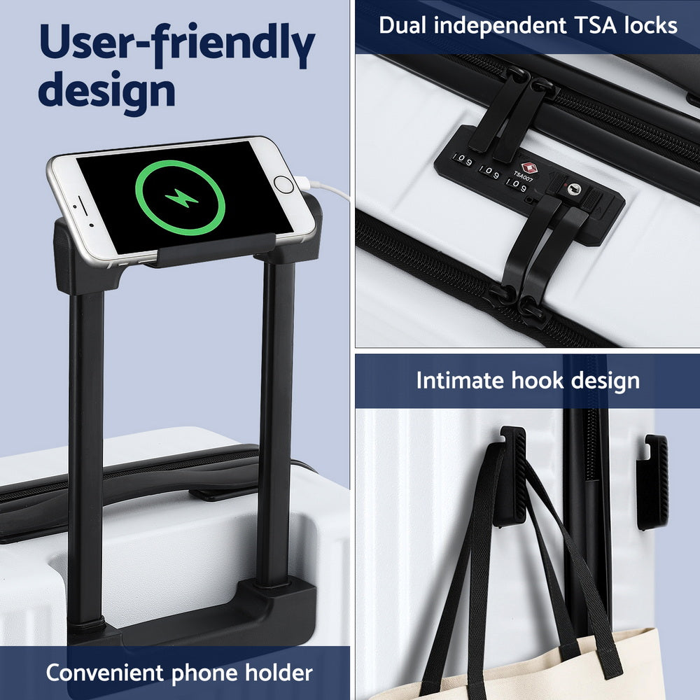 Features 20" carry on front pocket luggage case Quick-access laptop compartment Premium ABS material with durable matte finish Convenient phone holder Dual TSA-approved combination locks Intimate hook design Built-in retractable trolley system Smooth 360�� dual spinner wheels Spacious interior with elastic cross straps Divider panel and multi-functional mesh pockets Top and side carrying handles